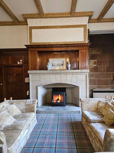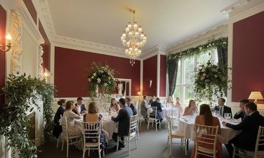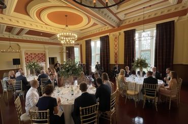 Connecting from the grand hallway are three other majestic rooms. The oak panelled library opens to the rear woods and is perfect for a wedding ceremony for 40, quiet moments, photos, or intimate drinks. The large ballroom, adjacent on the left, draped in rich tartan curtains, black chandeliers, and flooded with natural light, provides a stunning space for dancing. The dining room to the right seats up to 50. Upstairs, the cinema room offers a luxurious escape for evening entertainment.