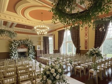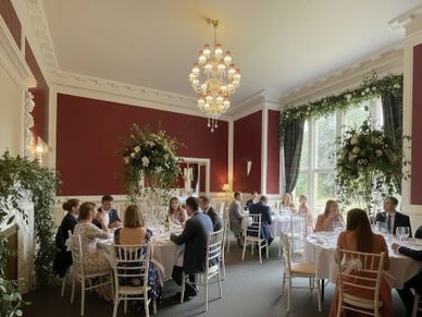 Bathed in a warm, romantic glow from vintage red and gold lighting, the room creates a sanctuary-like atmosphere that perfectly complements the rich jewel tones of Doonwood Hall. The large windows provide a breathtaking natural backdrop of ancient woodland, bringing the serenity of the outdoors into your ceremony.