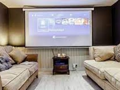 Visuals: A high-definition ceiling-mounted projector casts a massive, crisp image onto the far wall, turning movie night into a private premiere.